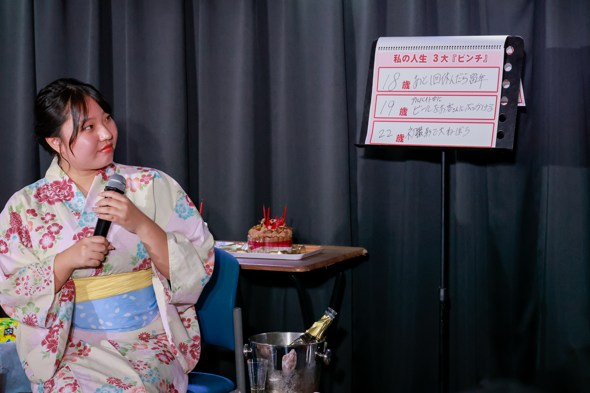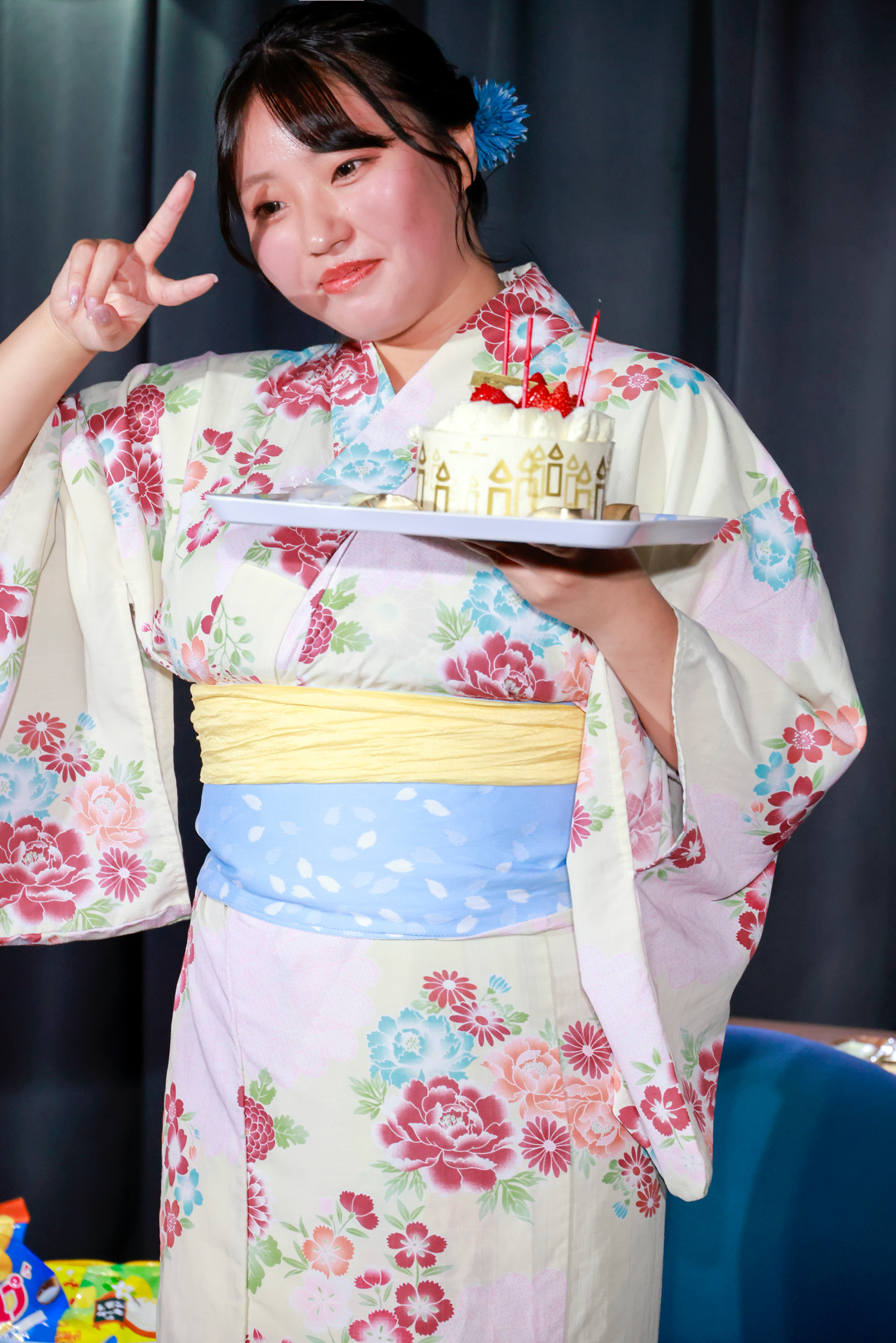 「今年はまだ浴衣を着ていないし、こういう機会じゃないと着られないから」と、キュートな浴衣姿で登場したはるちゃん。残暑が続くこの時期でも、涼しげで愛らしい姿がファンを魅了しました。ファンからの愛情たっぷりのシャンパンで乾杯し、会場は一気に華やかな雰囲気になりました。
