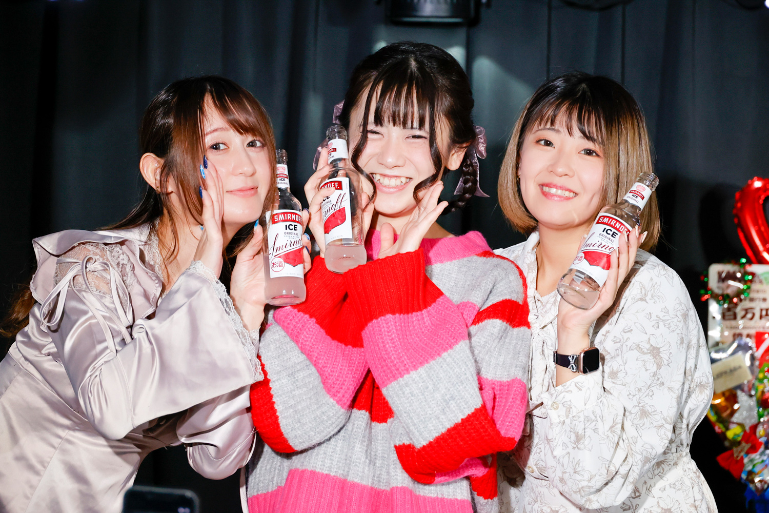 登場すると、まずは藍ちゃんともあちゃんが自己紹介をし、続いてあずさちゃんを呼び込みます。ファンから贈られた大量のドリンクで盛大に乾杯すると、会場は一気に華やいだ空気に包まれました。