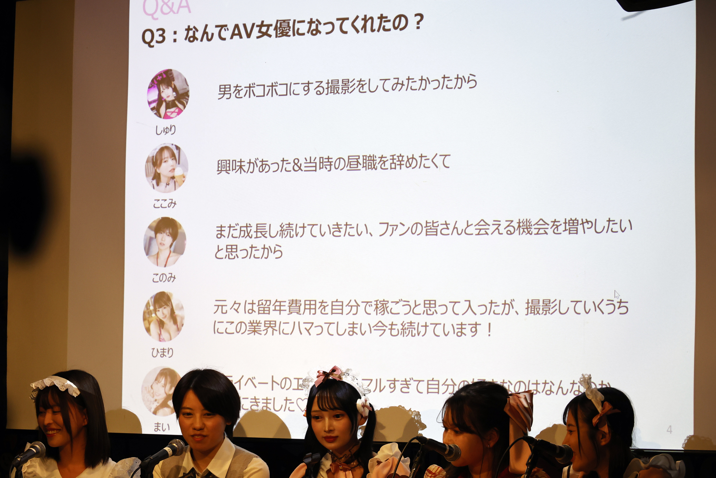 「なぜAV女優になったのか?」という質問には、「男をボコボコにする撮影をしてみたかったから」(しゅり)、「興味があったことと、当時の昼職を辞めたかったから」(ここみ)、「まだ成長し続けていきたいし、ファンのみなさんと会える機会を増やしたかったから」(好実)、「留年費用を自分で稼ごうと思って入ったけれど、撮影を重ねるうちにこの業界にハマった」(ひまり)、「プライベートのエッチがノーマルすぎて、自分の好みが何なのか探しに来た」(舞衣)など、率直な言葉が続きました。