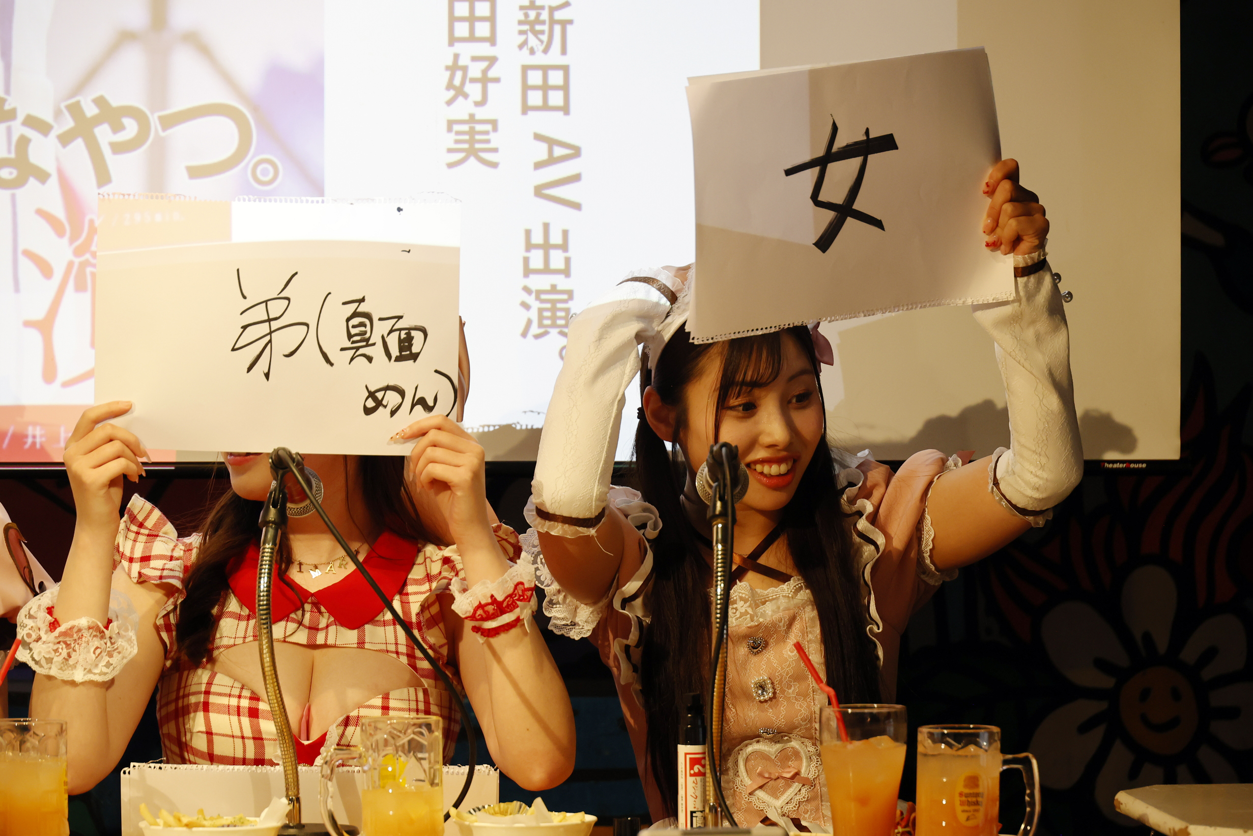 最初のコーナーは「AV秘話トーク」。出演女優たちに事前に行われた10のアンケート質問が、スクリーンに映し出されます。こちらの「一言で自分を表すなら?」という質問の回答風景もYouTube「夕やけちゃんねる」でダイジェスト配信されています!